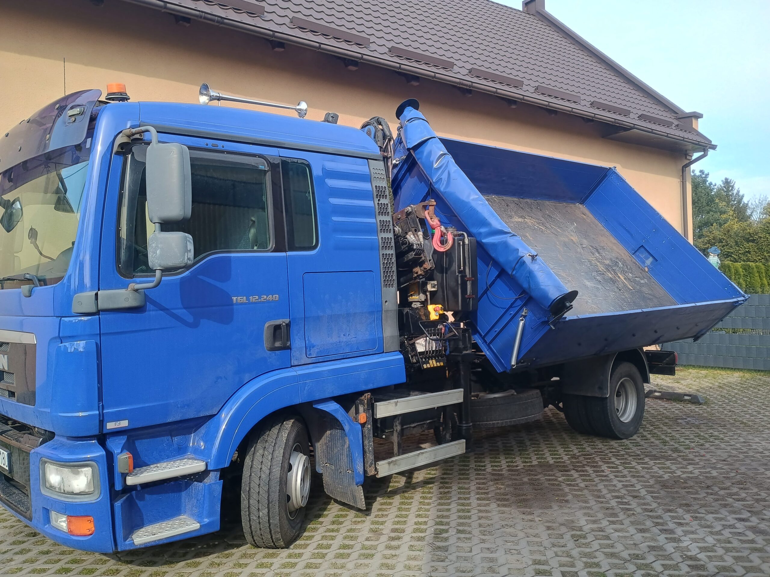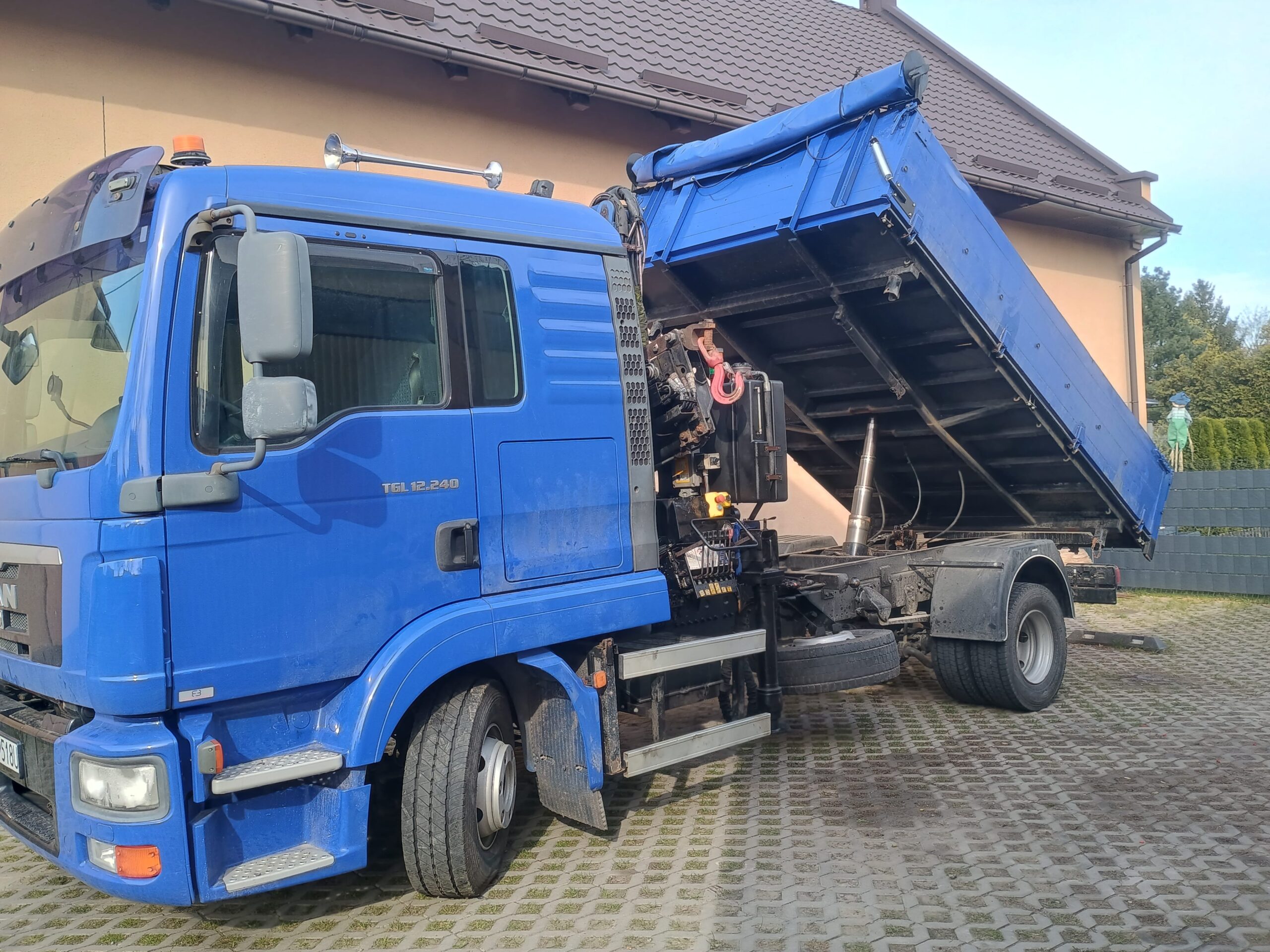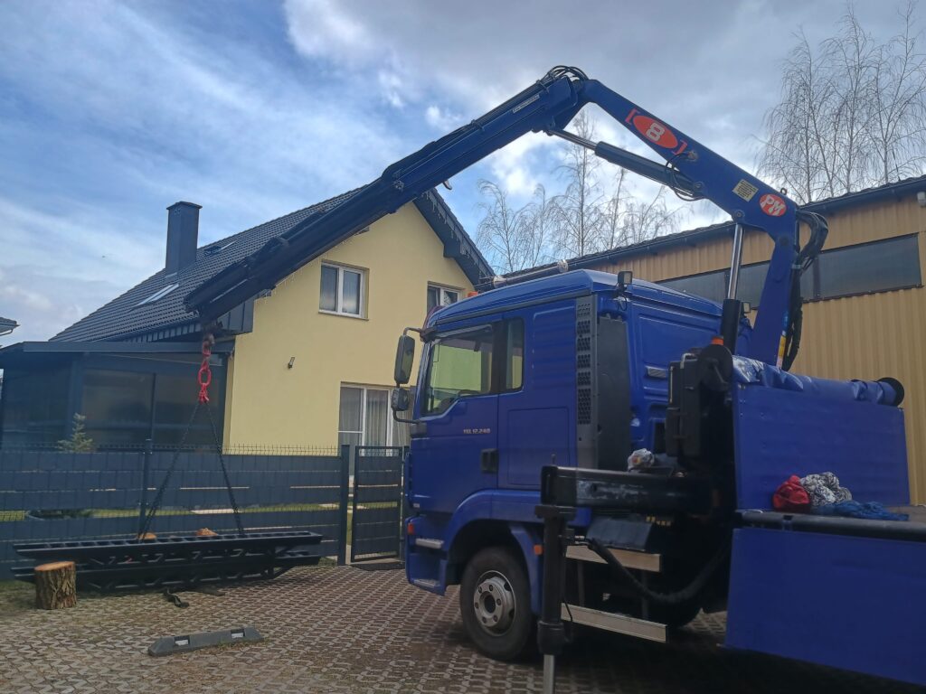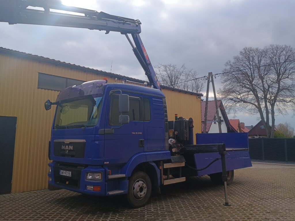 Dysponujemy samochodem Man TGL o ładowności do 5,5 t, wyposażonym w HDS o udźwigu 4,25 t, co pozwala na sprawny załadunek i rozładunek bez konieczności użycia dodatkowego sprzętu.